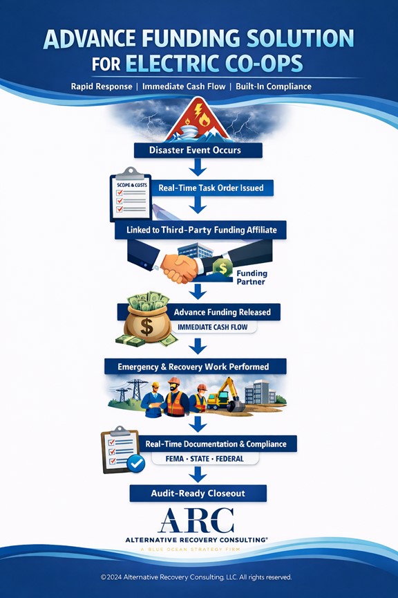 ARC Blue Ocean Disaster Recovery model brings light to Electric Cooperatives (Electric Co-Ops) that face increasing disaster frequency while reimbursement timelines continue to lag. Traditional recovery models require the Electric Co-Ops to front millions in emergency costs, exposing reserves, increasing debt, and creating compliance risk. ARC introduces a Blue Ocean Strategy that fundamentally changes disaster recovery economics. We issue real-time task orders that are directly linked to our third-party funding affiliate, providing advance funding for eligible emergency and recovery work. This enables Electric Co-Ops to move faster when the unthinkable happens. This structure delivers immediate liquidity while embedding FEMA and state compliance from the outset.